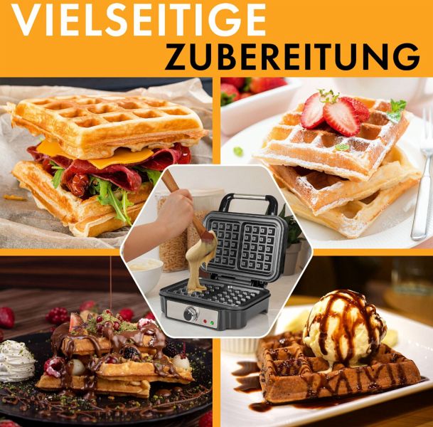 - Einfache Reinigung - durch die antihaftbeschichteten Backflächen bleibt kein Teig an den 2 großen Backflächen kleben, zusätzlich ist das Waffeleisen so leichter zu reinigen. Dank der umlaufendenden Rille wird überschüssiger Teig aufgefangen