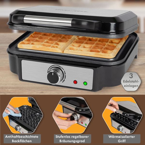 - Das Doppelwaffeleisen hat Edelstahl-Einlagen an Deckel, Griff und Front. Der handliche Griff ist wärmeisoliert und lässt sich daher komfortabel und sicher öffnen