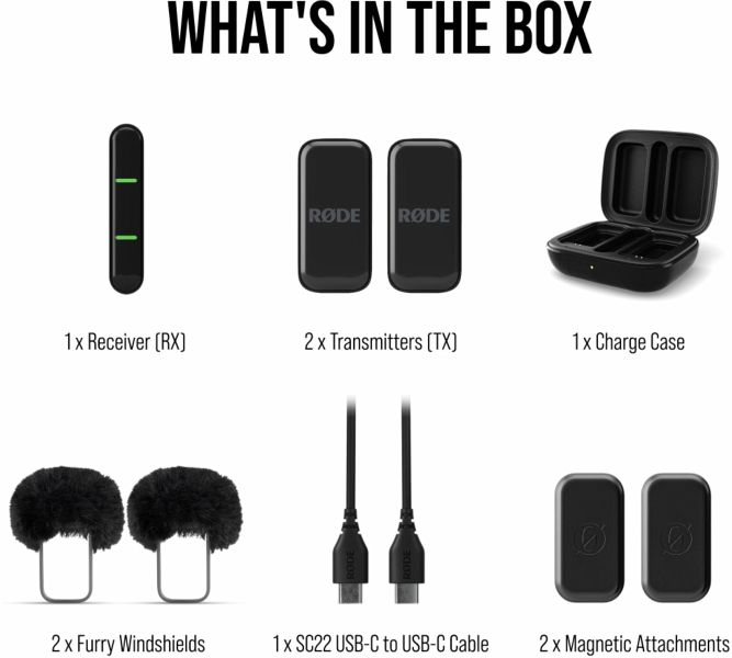 - Lieferumfang: 2x Transmitter (TX), 1x Receiver (RX), 1x Ladecase, 1x USB-C zu C-Kabel (SC22), 2x Windschutz, 2x Magnetbefestigung