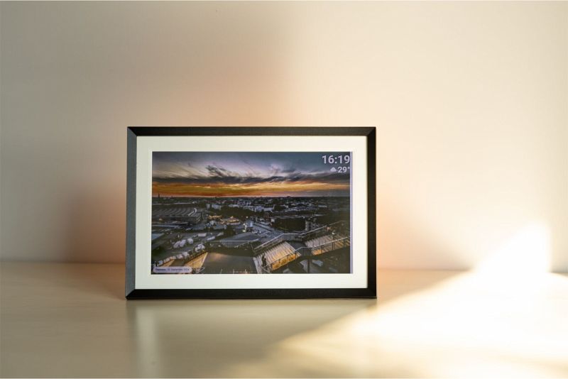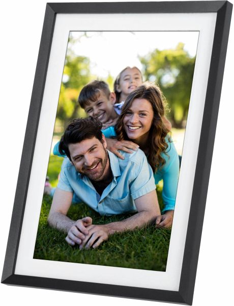 Der schwarze Rahmen und das weiße Passepartout verleihen dem digitalen Bilderrahmen eine klassische Optik, die sich harmonisch in jedes Wohnambiente einfügt.