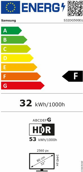 Marke: SamsungModellkennung: S32DG500EUEnergieeffizienzklasse von A (höchste Effizienz) bis G (niedrigste Effizienz): FLeistungsaufnahme im Ein-Zustand (kWh/1000h): 32Energieeffizienzklasse im HDR-Modus von A (höchste Effizienz) bis G (niedrigste Effizienz): GLeistungsaufnahme im Ein-Zustand im HDR-Modus (kWh/1000h): 53Sichtbare Bildschirmdiagonale (cm): 80Sichtbare Bildschirmdiagonale (Zoll): 32Bildschirmauflösung (Pixel): 2560 x 1440