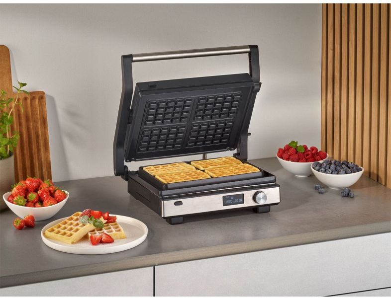 Dank der vordefinierten Programme und der stufenlosen Temperaturregelung gelingt jedes Gericht optimal. Ob knuspriges Steak, zartes Gemüse oder fluffige Waffeln - die spülmaschinengeeigneten Platten lassen sich mühelos wechseln und reinigen.
