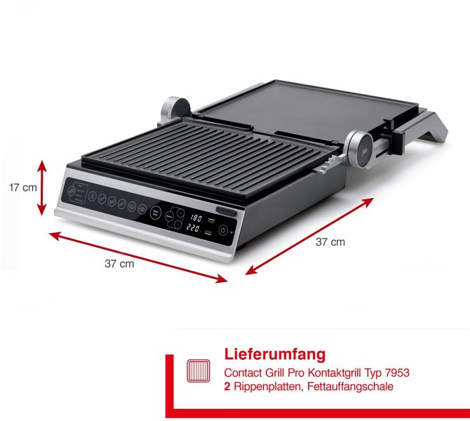 - Aufklappbar um 180° (im aufgeklappten Zustand kann jede Grillplatte separat eingestellt werden