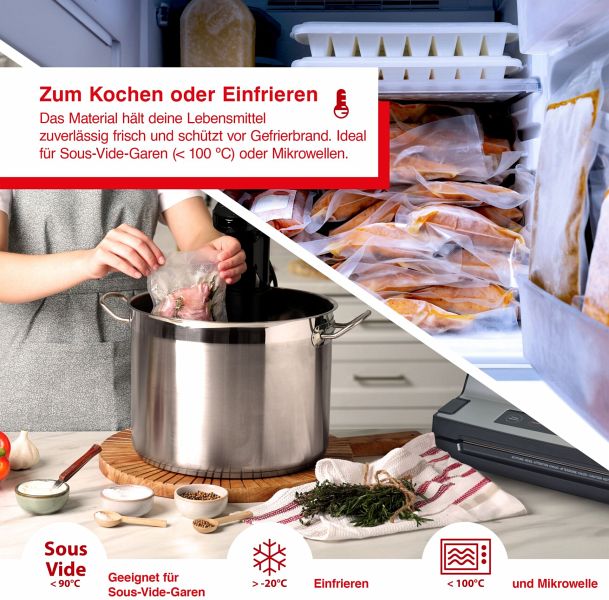 Sie sind ideal als Sous Vide Beutel bei Temperaturen unter 100°C geeignet und können in der Mikrowelle verwendet werden, solange die Temperatur unter 100°C bleibt. Auch das Erhitzen in kochendem Wasser für bis zu vier Stunden ist kein Problem. Ihre Lebensmittel bleiben auch bei Tiefkühltemperaturen unter -20°C sicher und geschützt, ohne dass Gefrierbrand entsteht.