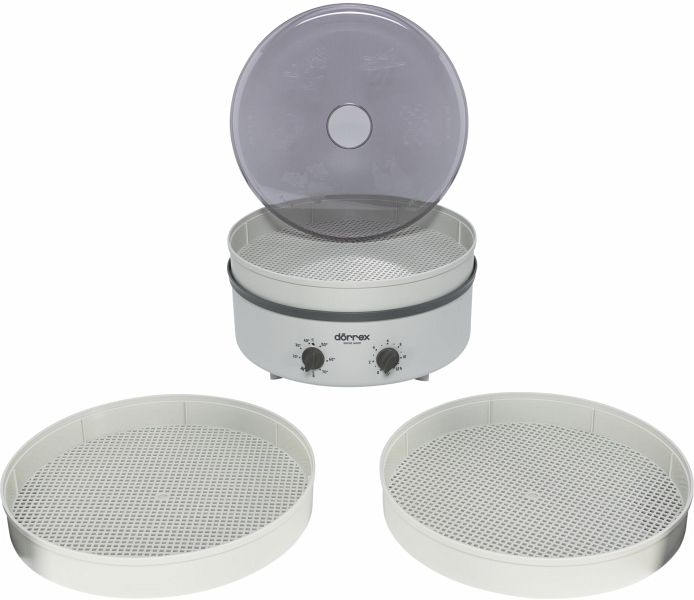 Obst und Gemüse selber trocknen mit Dörrex von Stöckli. Die stufenlos einstellbare Temperatur sorgt für präzises Dörren. Die aktive Warmluftzirkulation ermöglicht eine gleichmäßige Trocknung, während der Deckel mit eingeprägten Dörrzeiten für verschiedene Sorten die Handhabung erleichtert.