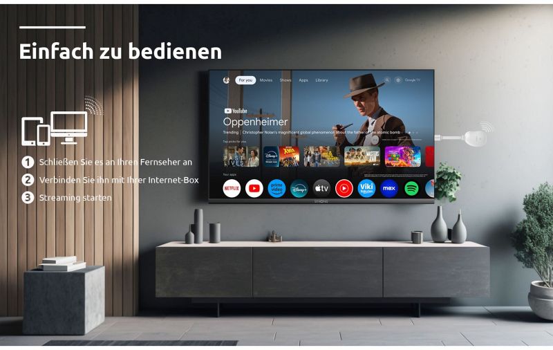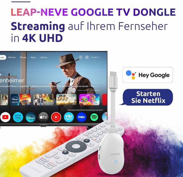 Der LEAP-NEVE ist ein schlanker und leistungsstarker Dongle, der aus einem Bildschirm einen Smart-TV macht und über Google TV eine große Auswahl an Filmen und Sendungen in zahlreichen Apps bietet. Dank Google Cast lassen sich Inhalte mühelos vom Smartphone oder Tablet auf den großen Bildschirm übertragen. Funktionen wie 4K UHD, Dolby Vision, Atmos, Wi-Fi 6 und ein integrierter Ethernet-Anschluss ermöglichen zudem erstklassige Streaming-Erlebnisse. Die Steuerung mit dem Google Assistant ist besonders komfortabel.