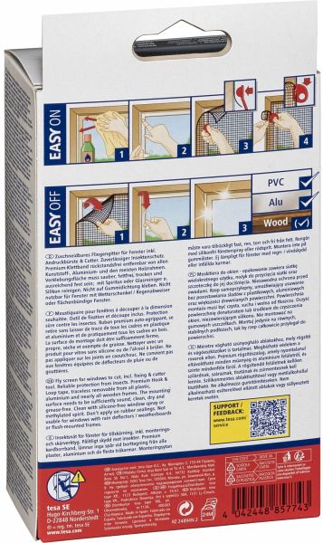 Das tesa Insect Stop Insektengitter für Fenster aus der Comfort-Serie überzeugt durch hochwertige tesa-Qualität und nutzt fortschrittliche Klebetechnologie. Es ermöglicht Frischluft im Haus, hält jedoch Insekten fern. Zur sicheren Befestigung dient ein selbstklebendes Klettband, das im Fensterrahmen angebracht wird.
