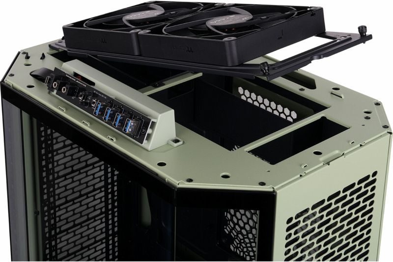 Das Tower 600 ist ein ATX-Gehäuse mit einem klassischen vertikalen Gehäusedesign und kommt in einer achteckigen Prismenform, die mit den Hidden-Connector-Motherboards kompatibel ist. Es unterstützt bis zu einem 420-mm-AIO-Radiator auf der rechten Seite und einem 360-mm-AIO-Radiator auf der linken Seite und kann bis zu dreizehn 120-mm-Lüfter oder neun 140-mm-Lüfter aufnehmen.