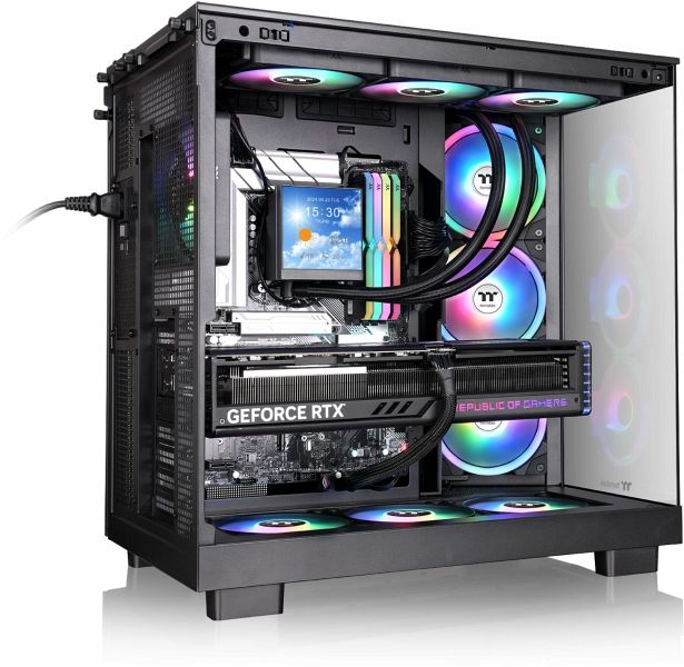 Oben und seitlich lassen sich jeweils Radiatoren bis 360 Millimeter unterbringen - das schafft Spielraum für leistungsfähige Wasserkühlungen. Die Lüfter sind leise und sorgen für einen gleichmäßigen Luftstrom, während die Rückseite mit einem zusätzlichen Lüfter die warme Luft effizient abführt.