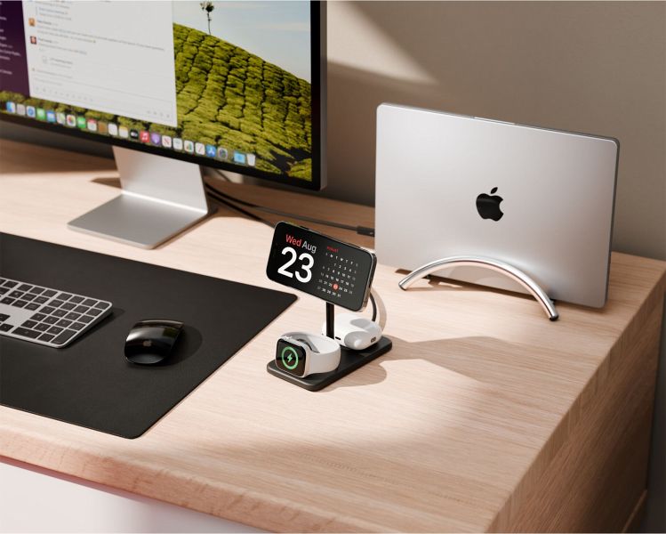 Eine induktive Ladefläche bietet sowohl Platz für qi-kompatible Smartphones als auch für AirPods und AirPods Pro Ladecases und lädt diese in Kombination mit dem Wireless Charging Case mit bis zu 5 Watt. Für die Apple Watch steht ein klappbarer Schnellladeadapter zur Verfügung, welcher die Apple Watch mit bis zu 5 Watt mit Strom versorgt. Der Adapter lässt sich dabei flexible aufklappen oder flach liegen, um minimalistisch zu wirken. Die Basis und das MagSafe-Ladegerät dieses schwarzen Aluminiumständers sind mit weichem Kunstleder überzogen.
