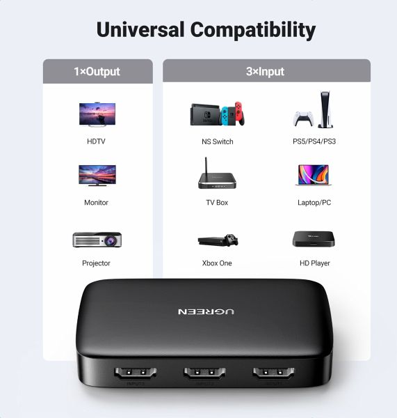 - HDMI Switch 3 in 1 out: UGREEN HDMI Switch ermöglicht den Anschluss von bis zu drei HDMI-Eingangsgeräten an ein HDMI-Display, um schnell und einfach zwischen verschiedenen Kanälen zu wechseln. Häufiges Ein- und Ausstecken entfällt