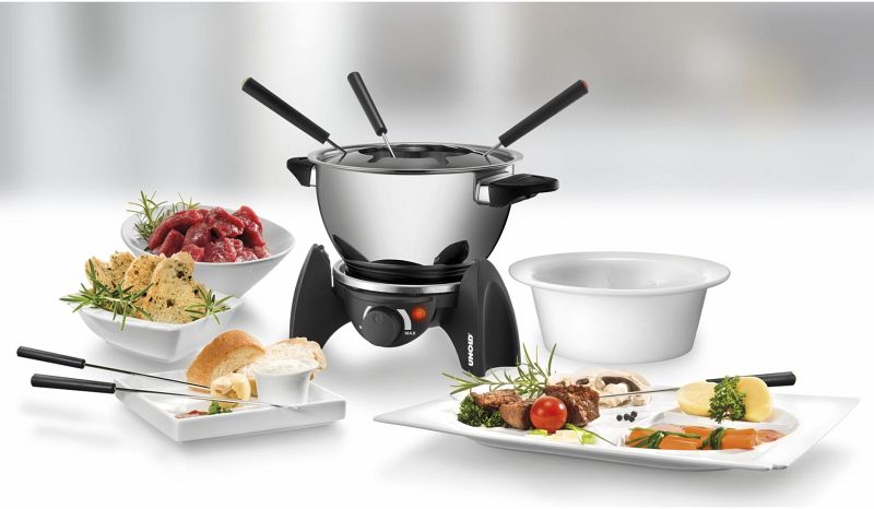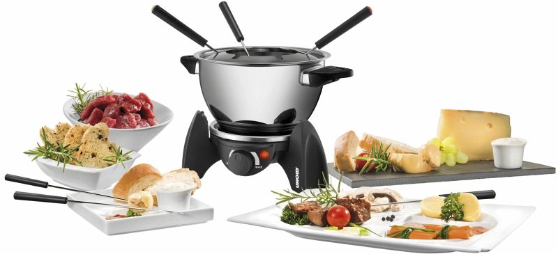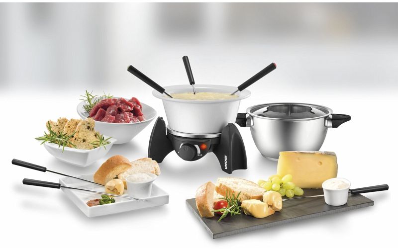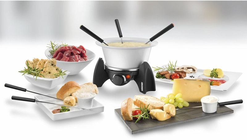 Alles in einem: Fleisch-Fondue, Käse-Fondue und Schoko-Fondue. Geht nicht? Geht doch mit dem FONDUE-SET von UNOLD. Neben dem Edelstahl-Topf für das klassische Fleisch-Fondue gibt es jetzt noch einen obendrauf: Den formschönen, unverwüstlichen Keramiktopf, in dem Schokolade oder Käse super-sanft geschmolzen werden können. Nichts kann anbrennen, dank eines stufenlos regulierbaren Temperaturreglers mit Kontrollleuchte. Und damit es der Tischplatte nicht zu heiß wird, steht das FONDUE-SET auf speziellen Cool-Touch-Füßen. Einen Spritzschutz aus Edelstahl mit Gabelhalterung macht die Sache perfekt.