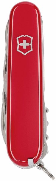 - 18 unterschiedliche Funktionen: Große und kleine Klinge, Dosenöffner, Schraubendreher 3 und 6 mm, Kapselheber, Drahtabisolierer, Stech-Bohr-Nähahle, Korkenzieher, Schere, Nagelfeile, Nagelreiniger, Metallsäge, Metallfeile, Mehrzweckhaken, Zahnstocher, Pinzette, Ring