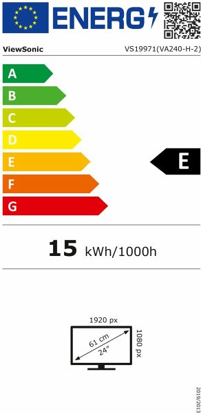 Marke: ViewSonicModellkennung: VS19971(VA240-H-2)Energieeffizienzklasse von A (höchste Effizienz) bis G (niedrigste Effizienz): ELeistungsaufnahme im Ein-Zustand (kWh/1000h): 15Energieeffizienzklasse im HDR-Modus von A (höchste Effizienz) bis G (niedrigste Effizienz): -Leistungsaufnahme im Ein-Zustand im HDR-Modus (kWh/1000h): -Sichtbare Bildschirmdiagonale (cm): 61Sichtbare Bildschirmdiagonale (Zoll): 24Bildschirmauflösung (Pixel): 1920 x 1080