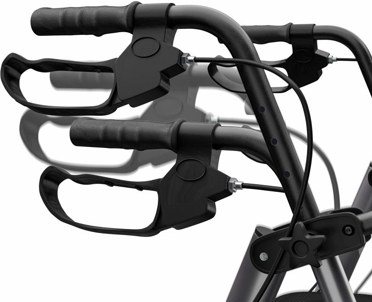 Zwei Bremsgriffe an den ergonomisch geformten Handgriffen unterstützen Sie zusätzlich über die Kontrolle des einfach zu handhabenden Rollator.