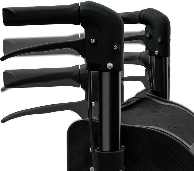 - Zwei Bremsgriffe an den ergonomisch geformten Handgriffen (jeweils Fahrtbremse und Feststellbremse)