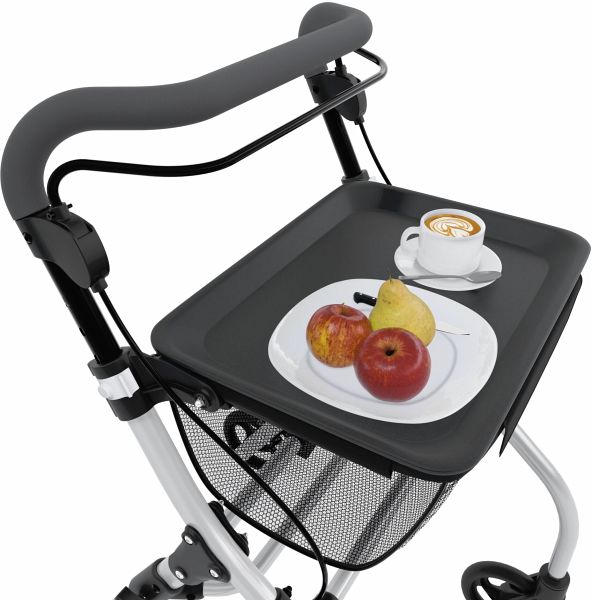 Der Rollator ist mit einem praktischen Ablagetablett und einem geräumigen Ablagekorb ausgestattet, die ausreichend Platz für Geschirr, Zeitschriften oder persönliche Gegenstände bieten. Die dreifach verstellbare Griffhöhe von ca. 89 bis 93,5 cm ermöglicht eine individuelle Anpassung an Ihre Bedürfnisse.