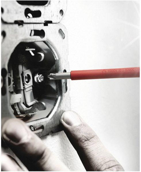 7-teiliges Schraubendreherset mit reduziertem Klingendurchmesser und integrierter Schutzisolation, so können tiefliegende Schraub- und Federelemente erreicht und betätigt werden. Kraftform Plus Griff für angenehm ergonomisches Arbeiten, bei dem Blasen und Schwielen vermieden werden. Harte Griffzonen für hohe Arbeitsgeschwindigkeit, weiche Griffzonen für hohe Drehmomentübertragung. Take it easy Werkzeugfinder mit Farbkennzeichnung nach Profilen und Größenstempelung - zum einfachen und schnellen Finden des benötigten Werkzeugs. Abrollschutz verhindert lästiges Wegrollen am Arbeitsplatz. Inklusive Spannungsprüfer und 1 Rack zur Aufbewahrung.