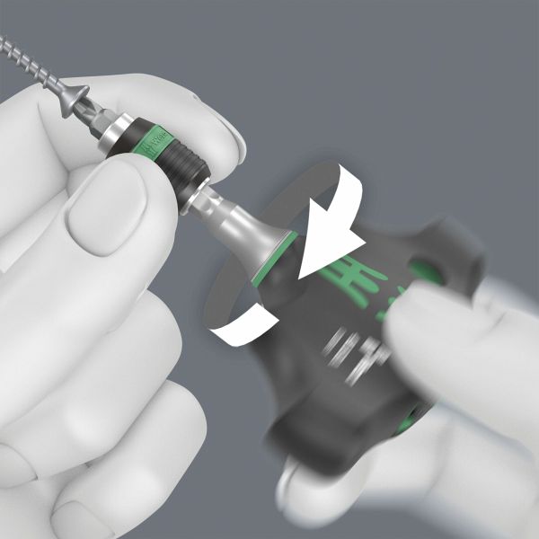 Die integrierte Ratsche mit Feinverzahnung (80 Zähne/Rückholwinkel 4,5°) vereinfacht und beschleunigt das Schrauben ohne mühsames Neuansetzen. Die vollständig in den Griff eingebettete Knarrenmechanik sorgt für sehr handliches und angenehmes Arbeiten. Mit Umschalthebel für bequemen Rechts/Links Richtungswechsel in Einhand-Bedienung. Die ergonomische Form des Griffs füllt den Handballen gut aus, die Finger liegen sicher in den weich gerundeten Griffmulden. Die ganze Hand findet Kontakt zum Griff, Reibungsverluste zwischen Hand und Griff werden vermieden. Bithalter für Bits mit 1/4" Außensechskantantrieb. Mit Rapidaptor-Technologie für blitzschnelles Wechseln der Bits.