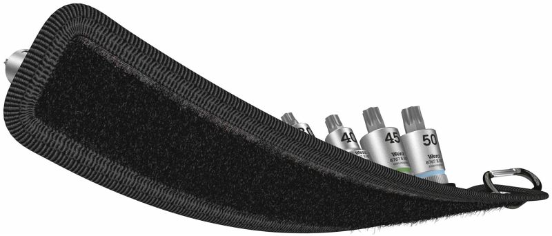 Robuster Textilgurt (Belt) im typischen Wera Design mit 9 Bitnüssen auf engstem Raum. Ein leichtgängiger Drehmechanismus sorgt für einen sicheren Halt und leichte Entnahme der Nüsse. Mit "Take it easy" Werkzeugfinder mit Farbkennzeichnung nach Größen - zum einfachen und schnellen Finden des benötigten Werkzeugs. Inklusive Karabinerhaken zur Befestigung an Gürtelschlaufen oder Taschen. Besonders kurze, stabile Bit-Nüsse mit den Vorzügen der Wera Bit-Technologie. Bitnüsse mit Haltefunktion für besonders komfortables Schrauben und reduzierter Gefahr des Schraubenverlustes beim Zuführen zum Werkstück. Mit Vliesrücken und Klettklebestreifen zur einfachen Befestigung z.B. an Wand, Regal, Werkstattwagen und Wera 2go Werkzeugtransportsystem.