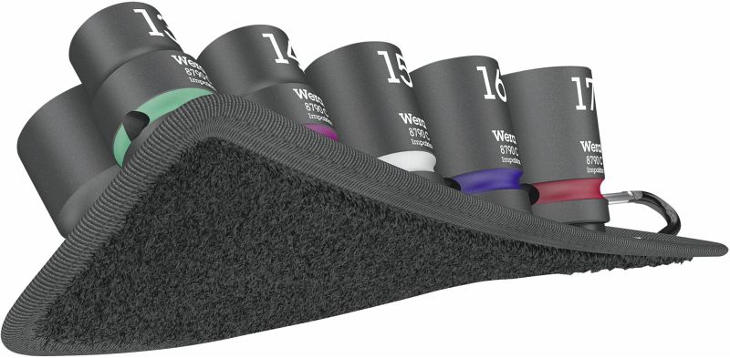 Robuster Textilgurt (belt) im typischen Wera Design mit 9 Impaktor-Steckschlüssel-Einsätzen auf engstem Raum. Ein leichtgängiger Drehmechanismus sorgt für einen sicheren Halt und leichte Entnahme der Nüsse. Inklusive Karabinerhaken zur Befestigung an Gürtelschlaufen oder Taschen. Mit Vliesrücken und Klettklebestreifen zur einfachen Befestigung z. B. an Wand, Regal, Werkstattwagen und Wera 2go Werkzeugtransportsystem. Impaktor-Nüsse für den Einsatz mit elektrisch oder mit Druckluft angetriebenen Schlagschraubern mit 12,5 mm/1/2"-Antrieb. Die Impaktor-Technologie sorgt für überdurchschnittliche Standzeiten auch bei extremen Anforderungen. Mit Take it easy Werkzeugfinder mit Farbkennzeichnung nach Größen - zum einfachen und schnellen Finden des benötigten Werkzeugs. Mit Sechskantprofil und Nut mit Bohrung. Das Sechskantprofil ermöglicht die Übertragung hoher Kräfte und belastet die Kanten der Schraubenmutter bzw. des Schraubenkopfes weniger als ein Zwölfkantprofil. Für Außensechskantschrauben und -muttern.