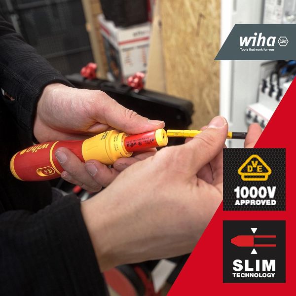 Der easyTorque Adapter ermöglicht ein kontrolliertes und sicheres Verschrauben bei elektrischen Anwendungen. Er schützt vor Materialschäden und Nachbesserungen und passt zu allen slimVario Produkten. Mit ihm lassen sich slimVario-Schraubendreher mit Bithalter, slimVario Stubby electric und LiftUp electric mit Bit-Magazin schnell in Drehmomentwerkzeuge verwandeln. Ein Klicksignal und eine Drehbewegung zeigen an, wann das Drehmoment erreicht ist. Der isolierte easyTorque Adapter hält die 75 mm slimBits sicher fest und erfüllt die Norm IEC 60900 für Arbeiten an spannungsführenden Teilen bis 1.000 V AC.