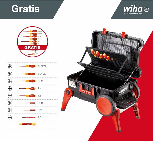 Robuster und stabiler Werkzeugkoffer mit großem Stauraum. Innovative Werkzeugtafeln sorgen für Ordnung und einge gute Übersicht. Der Koffer lässt sich mit den extra großen Rädern leicht über unebenes Gelände oder Treppen ziehen. Er hat ausklappbare Beine, die ihn zu einem rutschfesten Tritt machen. Er ermöglicht eine bequeme, rückenschonende Entnahme der Werkzeuge durch die erhöhte Position. Er hat eine V-förmige Kerbung mit Skala im Deckel, die das Absägen von z.B. einem Kabelkanal auf der Baustelle vereinfacht.