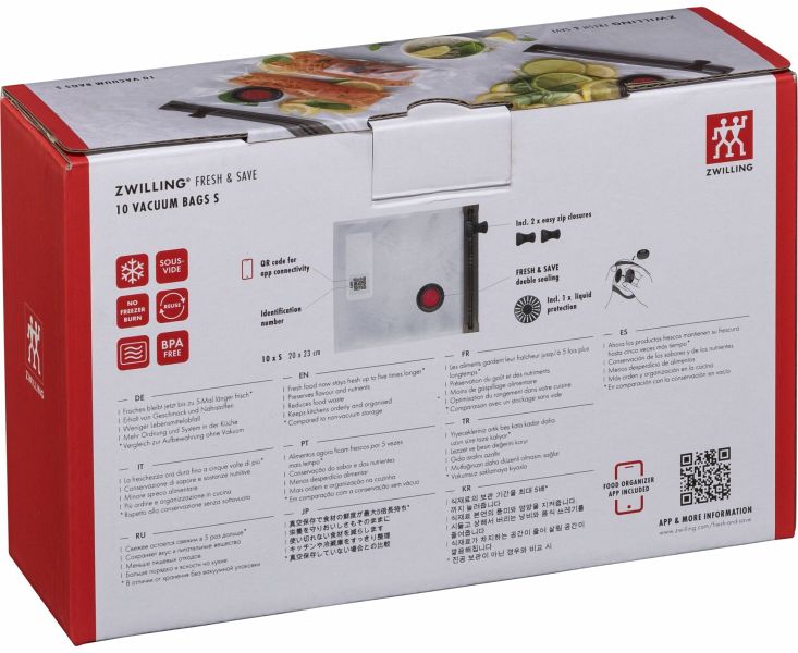 Durch die Vakuumversiegelung bleiben nicht nur die Lebensmittel länger frisch, die Beutel eignen sich außerdem perfekt zum Einfrieren und durch ihre Hitzebeständigkeit auch hervorragend zum Sous-vide-Garen oder zum Aufwärmen in der Mikrowelle. Der aufgedruckte QR-Code ermöglicht das Tracken der Lebensmittel (z.B. Haltbarkeitsdatum / Zwilling App erforderlich).