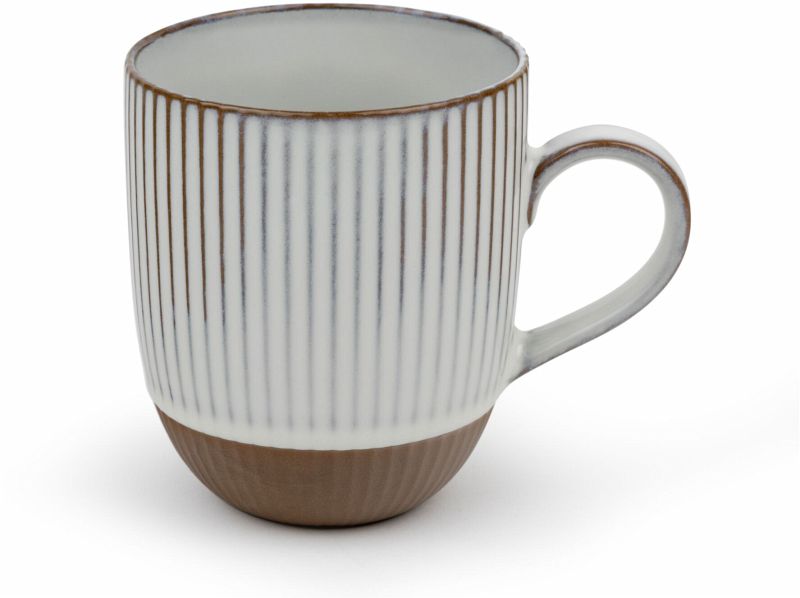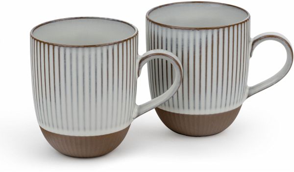 Set aus zwei modernen Tassen mit Henkel und einem Fassungsvermögen von 450 ml. Die Tassen sind spülmaschinengeeignet und mit einem Streifenmuster versehen.