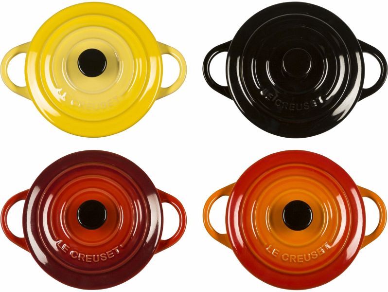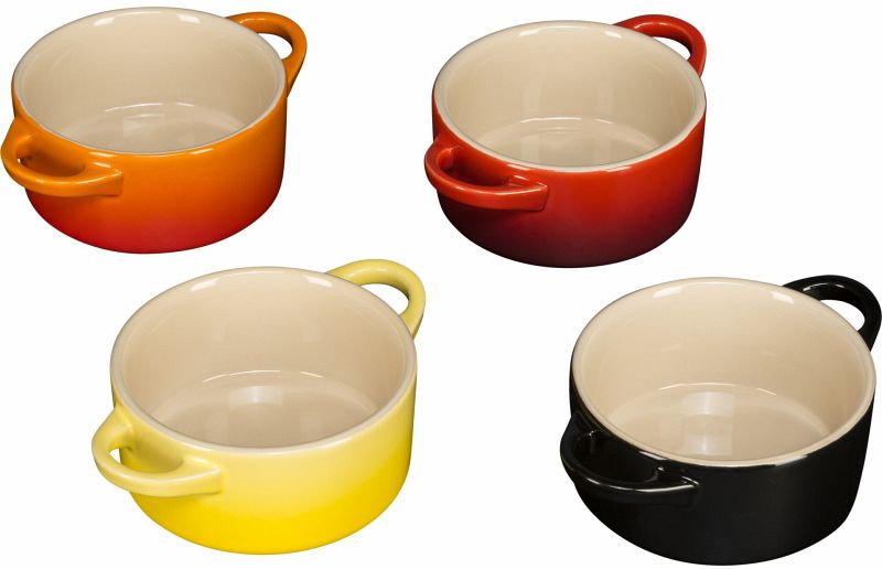 Set mit vier klassischen Mini-Cocottes aus hochwertigem Steinzeug von Le Creuset. Eignet sich für die Reinigung in der Spülmaschine, und kann im Backofen, der Mikrowelle und im Tiefkühlfach verwendet werden.