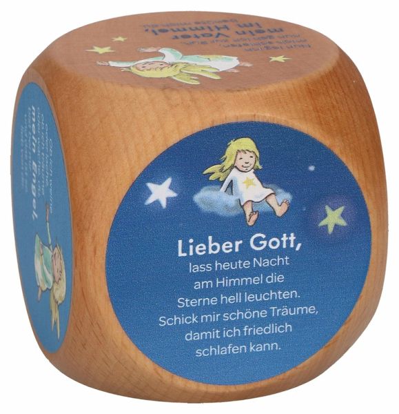 Entdecken Sie diesen liebevoll gestalteten Buchenholzwürfel, der mit seinen Illustrationen von Hartmut Bieber zum Blickfang wird! Mit einer Größe von 6 cm x 6 cm x 6 cm und einem farbenfrohen Design auf naturbelassenem Hintergrund ist jeder der Würfelseiten mit einem geprägten Motiv versehen, das den Produkttext unterstreicht. Dieses Einzelstück ist ideal als Geschenk für Kinder zur Kommunion oder anderen wichtigen kirchlichen Feiertagen geeignet. Lassen Sie Kinderaugen strahlen, indem Sie jeden Abend vor dem Zubettgehen ein neues Gebet auswürfeln und gemeinsam aufsagen. Eine Illustration zeigt etwa einen Engel, der von einer Wolke runterschaut - ein passendes Sinnbild für den Inhalt des dazugehörigen Abendgebetstextes.