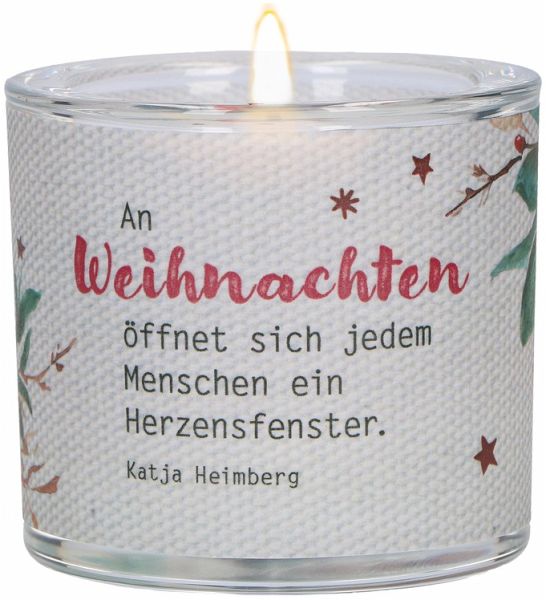 Erleuchte deine Weihnachtszeit mit diesem eleganten, mundgeblasenen Glaswindlicht. Der farbig bedruckte Pergamentumleger schafft eine stimmungsvolle Atmosphäre. Mit einem Durchmesser von 6,5 cm und einer Höhe von 6 cm ist es die perfekte Größe für Teelichter und eignet sich hervorragend als dekorativer Hingucker oder Geschenk.Der Text auf dem Windlicht lautet: An Weihnachten öffnet sich jedem Menschen ein Herzensfenster. - eine berührende Botschaft von Katja Heimberg, die Wärme und Hoffnung verbreitet.Geliefert wird das Windlicht in einer grünen Geschenkverpackung, zusammen mit einem weißen Teelicht - eine wunderschöne Geschenkidee für die Weihnachtszeit.Hinweis: Bitte das Windlicht nur auf einem hitzebeständigen Untergrund stellen und beim Abbrennen der Kerze die Sicherheitsvorkehrungen beachten.