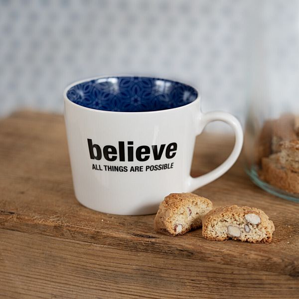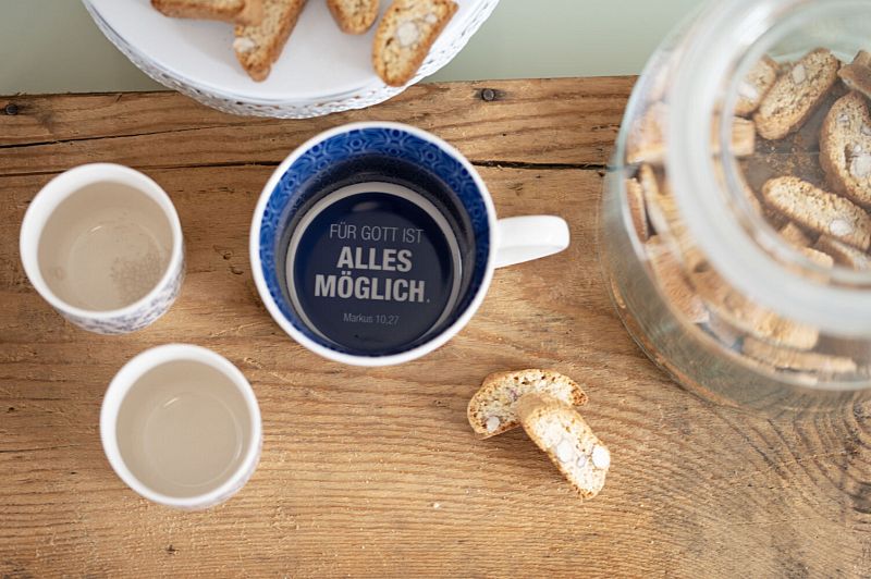 Versüßen Sie sich Ihre Tee- oder Kaffeerunde mit dieser farbenfrohen Tasse. Sie ist mit einer wertvollen Botschaft und einem Bibelvers versehen und verbreitet selbst bei tristem Wetter gute Laune. Dies ist ein von Hand dekoriertes Produkt. Die Tassen können daher in Form und Farbe variieren.Innenfarbe: dunkelblauMit Bibelvers: "Für Gott ist alles möglich." (Markus 10,17)