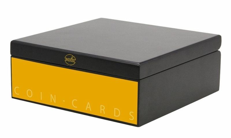 Die exklusive Art, Coin Cards platzsparend und sicher zu sammeln. Das Magazin für Coin Cards ist aus MDF-Holz hochwertig gefertigt und in matt-schwarz, auf der Vorderseite in Gold lackiert. Die Box faßt bis zu 48 Coin-Cards und schließt magnetisch. Die in schwarz gehaltene Innenausstattung ist in 24 Fächer eingeteilt; jedes Fach für bis zu 2 Karten. Die Karten stehen zum Betrachter hin geneigt im jeweiligen Fach. Die Abmessungen sind 200 x 200 x 78 mm