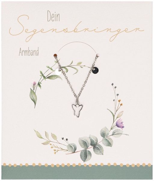 Eine zauberhafte Geschenkidee für Mädchen zur Erstkommunion. Das modisch designte Metall-Armband "Dein Segensbringer" passt mit einer Länge von 18,5 Zentimetern und einem verstellbaren Verschluss an jedem Handgelenk. In Kombination mit dem schönen Engel-Anhänger und mehreren runden Plättchen wird dieses Armband in der trendigen Farbe Silber zu einem einzigartigen Schmuckstück, das bewundernde Blicke auf sich zieht. Das in allen Teilen in dem beliebten Farbton Silber arrangierte Ensemble überzeugt mit einer harmonischen Optik.Der Anhänger in Form eines Schutzengels hat die Höhe von einem Zentimeter. Die raffinierten filigranen Plättchen sorgen für exklusive Glitzereffekte bei jedem Lichtschein. Das Metall-Armband mit dem attraktiven Anhänger wird in der optisch ansprechenden Geschenkverpackung geliefert. Das Motto des Armbands "Dein Segensbringer" ist auf der Verpackung aufgedruckt.Die nickelfreie Legierung ist für Allergiker geeignet und erfüllt die hohen Anforderungen der REACH Verordnung.Die Verpackung ist zudem als hochwertige Geschenk-Verpackung verwendbar.