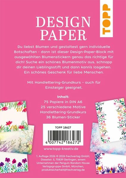 Du liebst Blumen, Handlettering und kreative Papeterie? Dann ist dieser Design Paper-Block im Blumen-Design genau das Richtige für dich! Der hochwertige Handlettering-Papierblock begeistert mit 25 liebevoll gestalteten Blumenmotiven und 36 passenden Stickern, mit denen du Grußkarten, Notizen oder Geschenke individuell verzieren kannst.