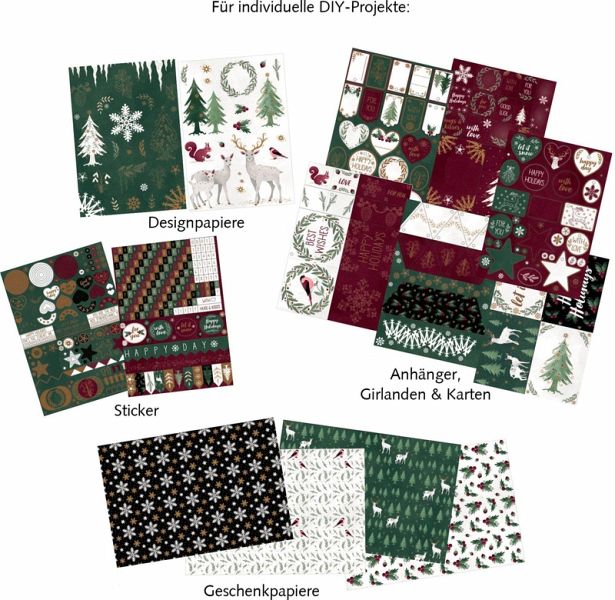 Hochwertige Designpapiere mit edlen MusternÜber 450 liebevoll gestaltete Sticker Vorgestanzte Karten (10) und Geschenkanhänger (50) mit Goldfolien-Details