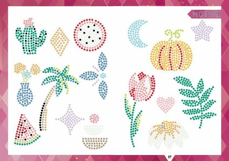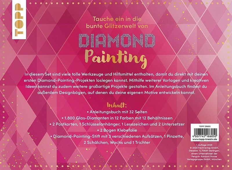 Anleitungsbuch mit 32 Seiten1800 Glasdiamanten in 12 FarbenAufbewahrungsboxDiamond Pen mit verschiedenen ApplikatorenWachs2 SteinschiffchenTrichterPinzetteProjekte zum Bekleben: 2 Untersetzer, Schlüsselanhänger, Lesezeichen, 2 Karten2 Blatt Klebefolie für eigene Kreationen