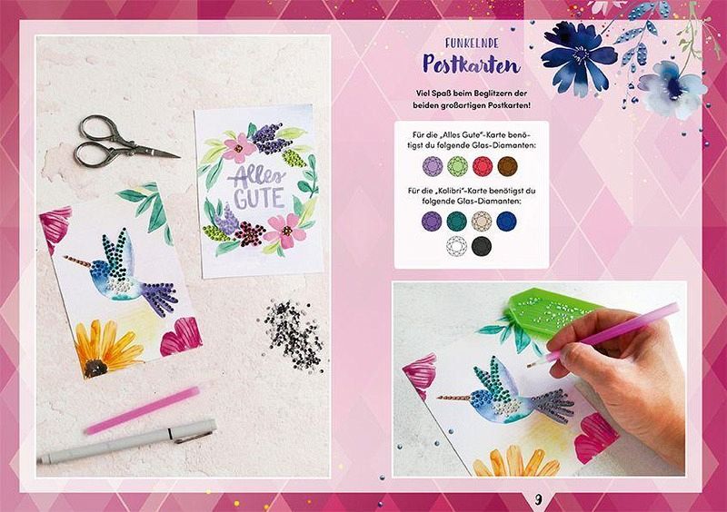 Entdecke die Vielzahl der beinhalteten Projekte zum Sofort-Loslegen. Die hochwertigen Glasdiamanten sind ein Hingucker auf allen Oberflächen. Dank der Aufbewahrungsbox sind die Glasdiamanten geordnet. Im Anleitungsbuch findest du noch weitere Inspirationen für eigene Projekte. Direkt anfangen und Losglitzern!