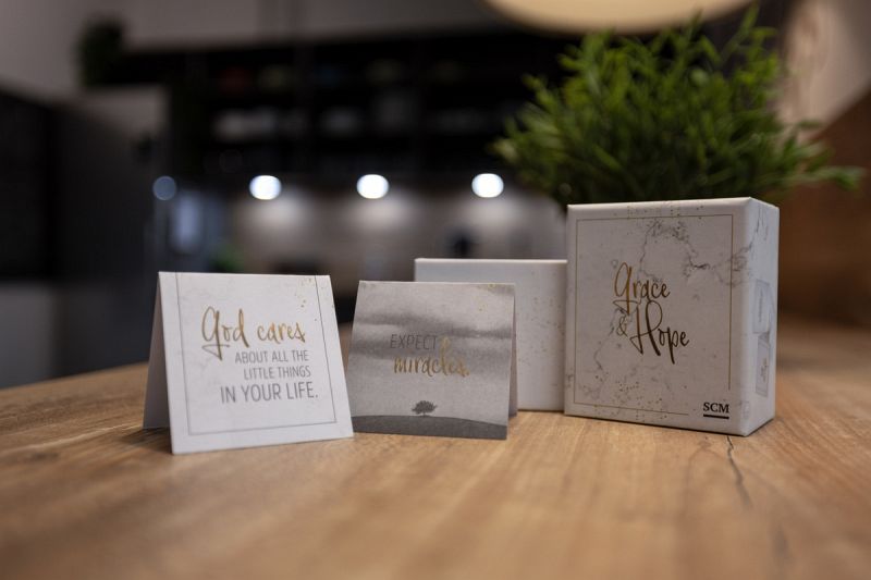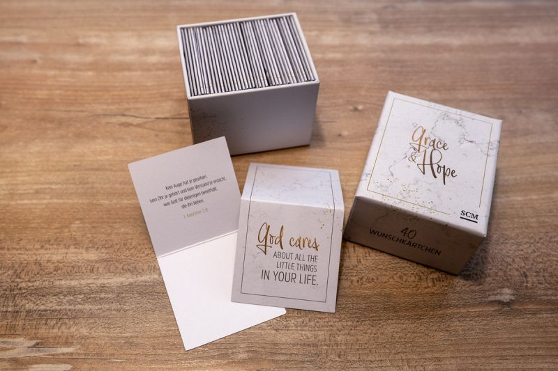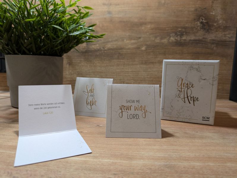 Besondere Kärtchen voller Gnade und Hoffnung. Das Besondere: Die Kärtchen lassen sich aufstellen. Klappt man sie auf, entdeckt man im Inneren einen ermutigenden Bibelvers und Platz für eine persönliche Botschaft, einen Wunsch oder einfach einen kleinen Gruß. Perfekt zum Weitergeben!