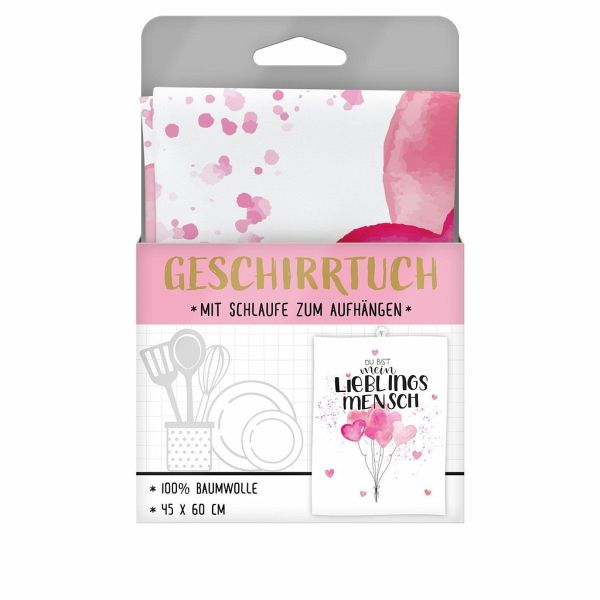 Das hochwertige Geschirrtuch mit dekorativen Motivdruch und Spruch "Du bist mein Lieblingsmensch", sorgt für Spaß in der Küche. Es hat eine Größe von 60 cm x 45 cm und besteht aud 100% Baumwolle. Das Geschirrtuch ist mit einer Schlaufe zum Aufhängen versehen. Mit diesem Tuch geht das Abtrocknen wie von selbst. Eine perfekte Geschenkidee zur Einweihungsfeier, zu Weihnachten, zum Geburtstag, als Mitbringsel oder einfach so.