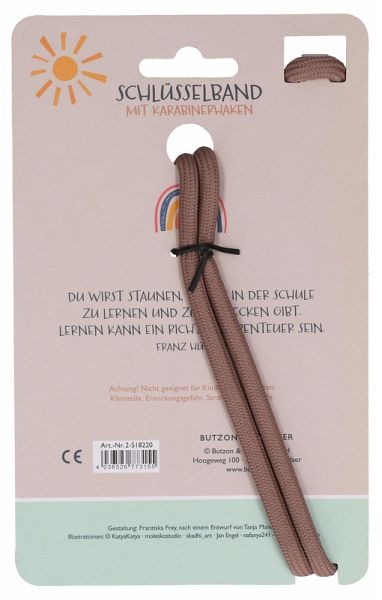beiges Schlüsselband mit schwarzem Karabinerhaken aus Metall mit gelasertem Fisch-Symbol; Länge ca. 41 cm; Lieferung auf BackcardText auf der Verpackung:"Du wirst staunen, was es in der Schule zu lernen und zu entdecken gibt. Lernen kann ein richtiges Abenteuer sein. (Franz Hübner)"