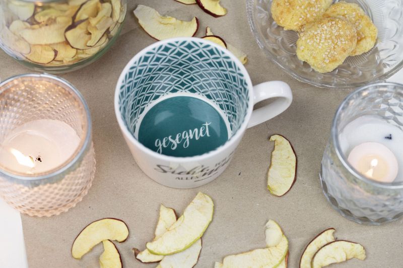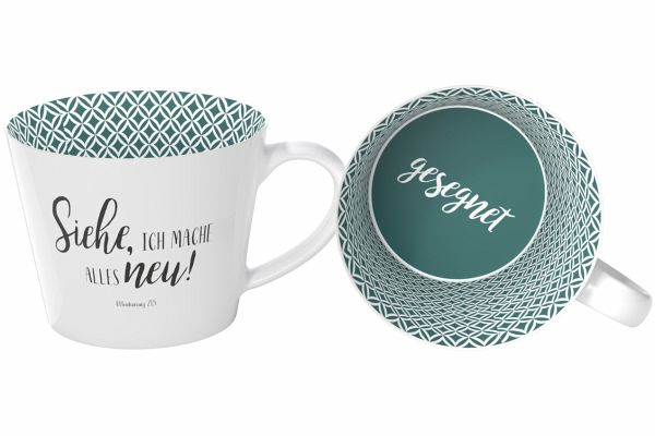 Versüßen Sie sich Ihre Tee- oder Kaffeerunde mit dieser farbenfrohen Tasse. Sie ist mit einer wertvollen Botschaft und einem Bibelvers versehen und verbreitet selbst bei tristem Wetter gute Laune. Dies ist ein von Hand dekoriertes Produkt. Die Tassen können daher in Form und Farbe variieren.Innenfarbe: türkisgrünInnentext: "gesegnet"
