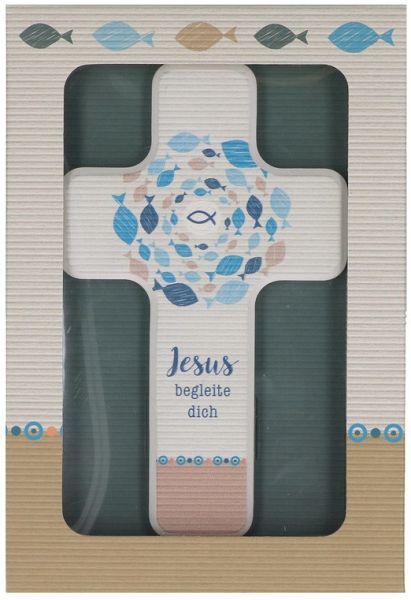 Dieses detailreich gestaltete Kinderholzkreuz misst 11 x 18 cm und wurde aus robuster Buche gefertigt. Eine weiße Lackierung bildet dessen Produktbasis, veredelt durch einen hochwertigen Farbdruck. Dieser zeigt ein Kreis der aus mehreren Fischen gebildet wird und in dessen Mitte ein Fisch abgebildet ist. Dieser symbolisiert die Zugehörigkeit zum Christentum und Gott, während der aufgedruckte Artikeltext unterstreicht: Mein Fest mit Jesus.Bei diesem robusten Kreuz für Kinder handelt es sich um ein Unikat, das in einer hochwertigen Geschenkverpackung geliefert wird.