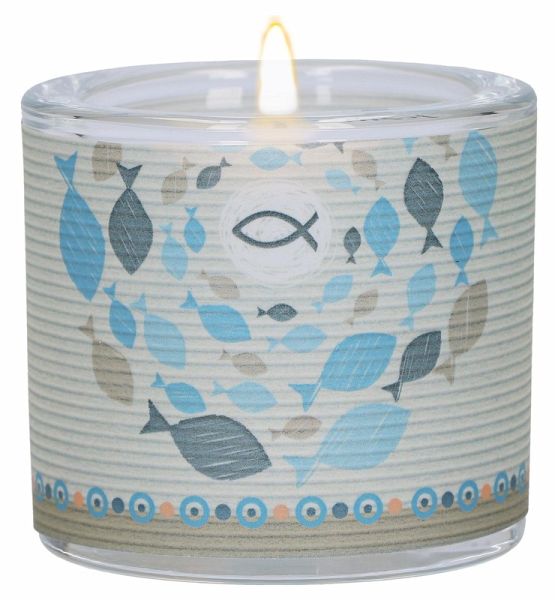 Mit den Worten "Jesus ist in unserer Mitte" wird das LichtMoment zum lieben Gruß zur Erstkommunion. Das modern gestaltete Windlicht besteht aus Glas und einem Pergamentumleger. Das Glas ist mit dem Mund in Form geblasen. Daher gehört dieses Modell zu den gern gesehenen Geschenken, die noch mit viel Liebe nach alter Handwerkskunst hergestellt werden.Der Pergamentumleger begeistert mit intensiv leuchtenden Farben, die auf dem Vierfarbdruck basieren. Wenn der Docht der Kerze brennt, kommen die Details auf dem Pergamentumleger wie die Fische im Kreis oder die Worte besonders schön zur Geltung. Das formschöne Windlicht mit dem Thema Kommunion hat die Maße 6,5 x 6 Zentimeter. Im Lieferumfang ist ein Teelicht enthalten. Das exklusiv designte Modell ist in einer Geschenkverpackung erhältlich.