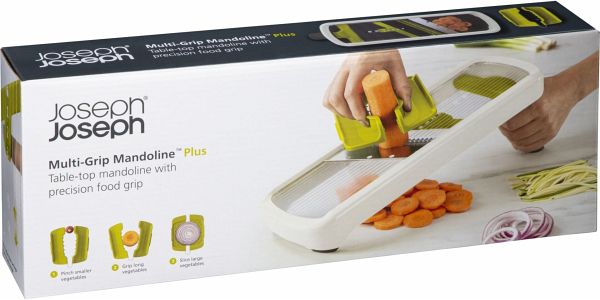 Der Multi-Grip Gemüsehobel Plus von Joseph Joseph ermöglicht ein sicheres und gleichmäßiges Schneiden von Obst und Gemüse. Dank des Präzisionsgriffs können verschiedene Griffarten genutzt werden, um kleine, runde oder längere Stücke optimal zu schneiden. Die scharfen Edelstahlklingen sind auf drei Schnittstärken und zwei Julienne-Stärken einstellbar.