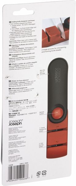 Der Rota Red Folding Knife Sharpener von Joseph Joseph ist ein eleganter, drehbarer Messerschärfer, der sich zum kompakten Verstauen zusammenklappen lässt. Er verfügt über zwei Keramik-Schärfscheiben für grobes und feines Schärfen und bietet durch seinen einfachen Griff sowie seine rutschfesten Standfüße zusätzliche Stabilität beim Schärfen. Dank seines einzigartigen, schwenkbaren Designs kann er platzsparend verstaut werden.