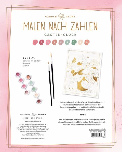 Malen nach Zahlen! Alles-drin-DIY-Set: Leinwand mit Goldfolien-Druck, Pinsel und Farben. Durch die aufgedruckten Zahlen werden die Farben vorgegeben und im Handumdrehen entsteht ein wunderschönes Kunstwerk. Creative Time - Zeit für dich!