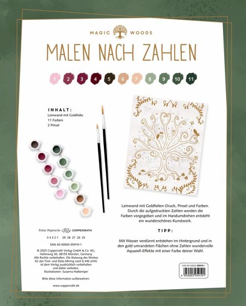 Malen nach Zahlen! Alles-drin-DIY-Set: Leinwand mit Goldfolien-Druck, Pinseln und Farben. Durch die aufgedruckten Zahlen werden die Farben vorgegeben und im Handumdrehen entsteht ein wunderschönes Kunstwerk. Creative Time - Zeit für dich!