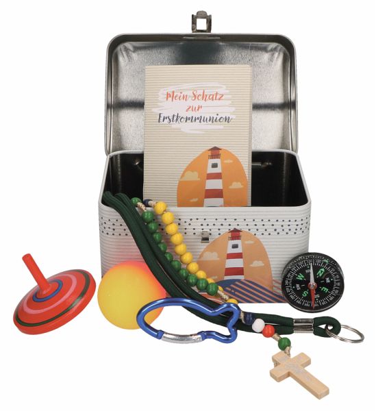 Die farbenfrohe Metallkiste mit Schloss ist ein besonderes Geschenk zur Erstkommunion. Die Kiste birgt eine Vielfalt an Überraschungen: Ein Begleitheft, einen Rosenkranz, einen Fisch-Karabinerhaken, ein Schlüsselband mit Schlüsselring, einen Flummi, ein Kreisel und einen Kompass.Dieses Geschenk spricht die Neugier und Freude der Kinder an und bietet eine abwechslungsreiche Auswahl. Eine passende Geschenkidee zur Erstkommunion, die Jungen und Mädchen gleichermaßen begeistert.